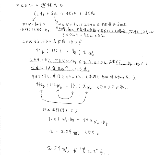 理論酸素量を求める問題 今回は先ほど作成した燃焼式(プロパン)から理論酸素量を求める問題を解いてみましょう。今回はちょっと手法を変えて、手書きでやってみます(計算問題の解法は手書きの方がイメージがつかみやすいかもしれない。。。と管理人は思い始めています。パソコンうちの方がよろしければ、パソコンうちに直したいと思います。)。字が汚くて大変申し訳ありません。 問 プロパン(C3H8) 1kgを燃焼させたときの、理論酸素要求量 (m3N) はいくらか? 解き方をGIFファイルで掲載しています→こちら 答えは2.54m3N |