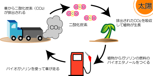 今、またガソリンの値段が上がっていっています。車に乗る、私 ろど・すた子にとっては、ガソリンの値上がりはお財布にとってとても厳しく辛いことです。。。 そんなとき、ニュースで「バイオガソリン」が発売されたというのを知りました。 価格は、今までのガソリンと大差はないものの、地球に優しいガソリンと言われてました。 「バイオガソリンって何だ??」と思い調べてみることに! バイオガソリンとは『植物生まれのバイオエタノールと石油系ガスのひとつであるイソブテンを合成した「バイオETBE」という物質を配合したレギュラーガソリン』だそうです。 (石油連盟HP http://www.paj.gr.jp/eco/biogasoline/ より引用) このガソリンが、なぜ地球に優しいと言われているのかというと、自動車が出す排気ガス中の二酸化炭素を光合成によて吸収する植物を原料にバイオガソリンの基のバイオエタノールを作製しているからだそうです。そのため、大気中の二酸化炭素の量が増えないということらしいのです。 図で表すとこんな感じでしょうか。