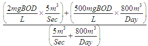 計算問題(3) BOD2mg/L、毎秒5m3の流量の河川に、BOD500mg/Lの排水を日量800m3排出したとき、河川のBOD濃度(mg/L)はおよそいくらか。 (1) 2 (2) 3 (3) 4 (4) 5 (5) 10 正解 (2)