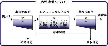 活性汚泥法について 活性汚泥法は、公害防止管理者の試験の中でも最も基本的な技術の一つです。 この方法は生物学的な汚水の処理法で、「好気性」処理です。 以下に一般的な活性汚泥法のフローを示しています。 ![]() 活性汚泥法は主に